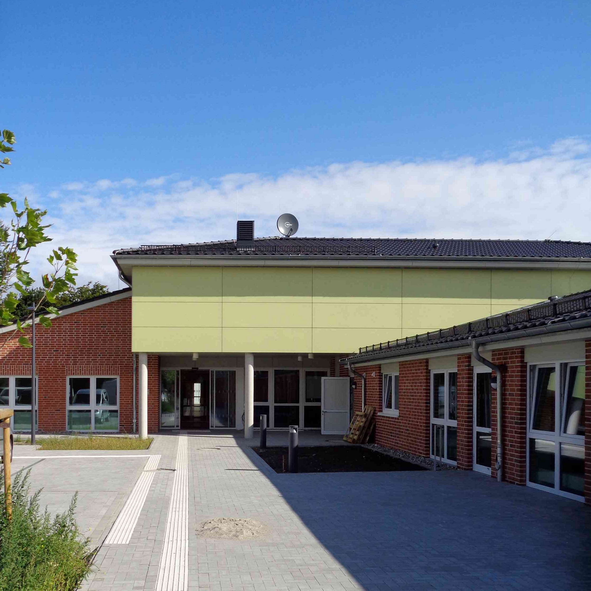 Für die überwiegenden Außenwandflächen ist ein Verblendstein gewählt worden. Diese Verblendschale wird im Bereich der Bewohnerzimmer oder auch an den überdachten Terrassen der Förderstätte durch Flächen mit Fassadenplatten unterbrochen. Für die Eindeckung der geneigten Dächer ist ein Ziegel verwendet worden.