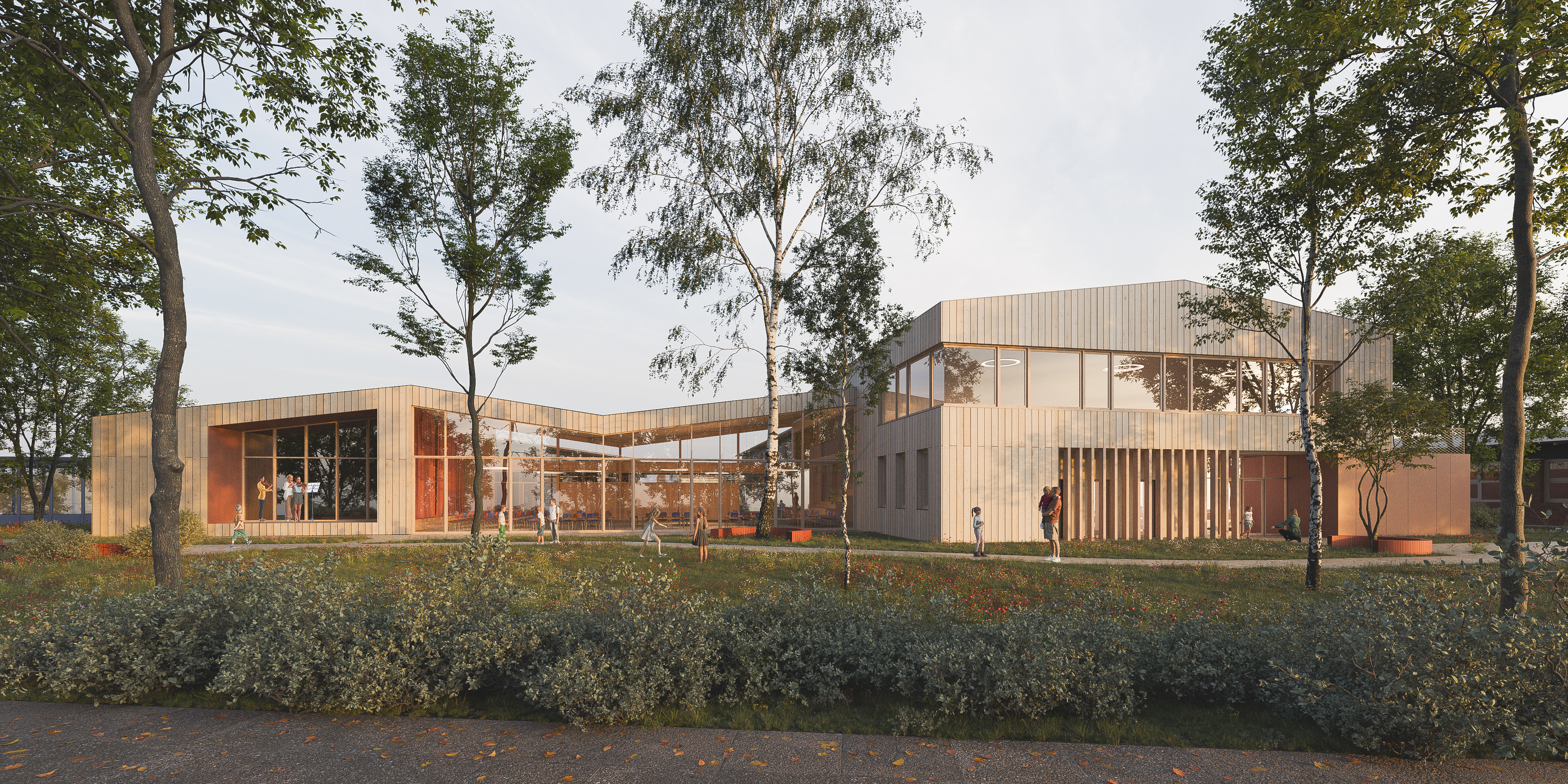 Die Erweiterung der Klaus-Groth-Schule schafft eine zukunftsorientierte Lernumgebung mit hoher Aufenthaltsqualität. Die vorhandene Gebäudestruktur wird aufgegriffen und in Holzbauweise nachhaltig fortgeführt. Die neuen Baukörper orientieren sich an der vorhandenen Kubatur, Dachneigung und Raumstruktur, werden jedoch gezielt weiterentwickelt, beispielsweise durch Dachterrassen oder optimierte Belichtungs- und Verschattungsstrategien. Dächer mit Begrünung und Photovoltaikanlagen sorgen für Nachhaltigkeit.