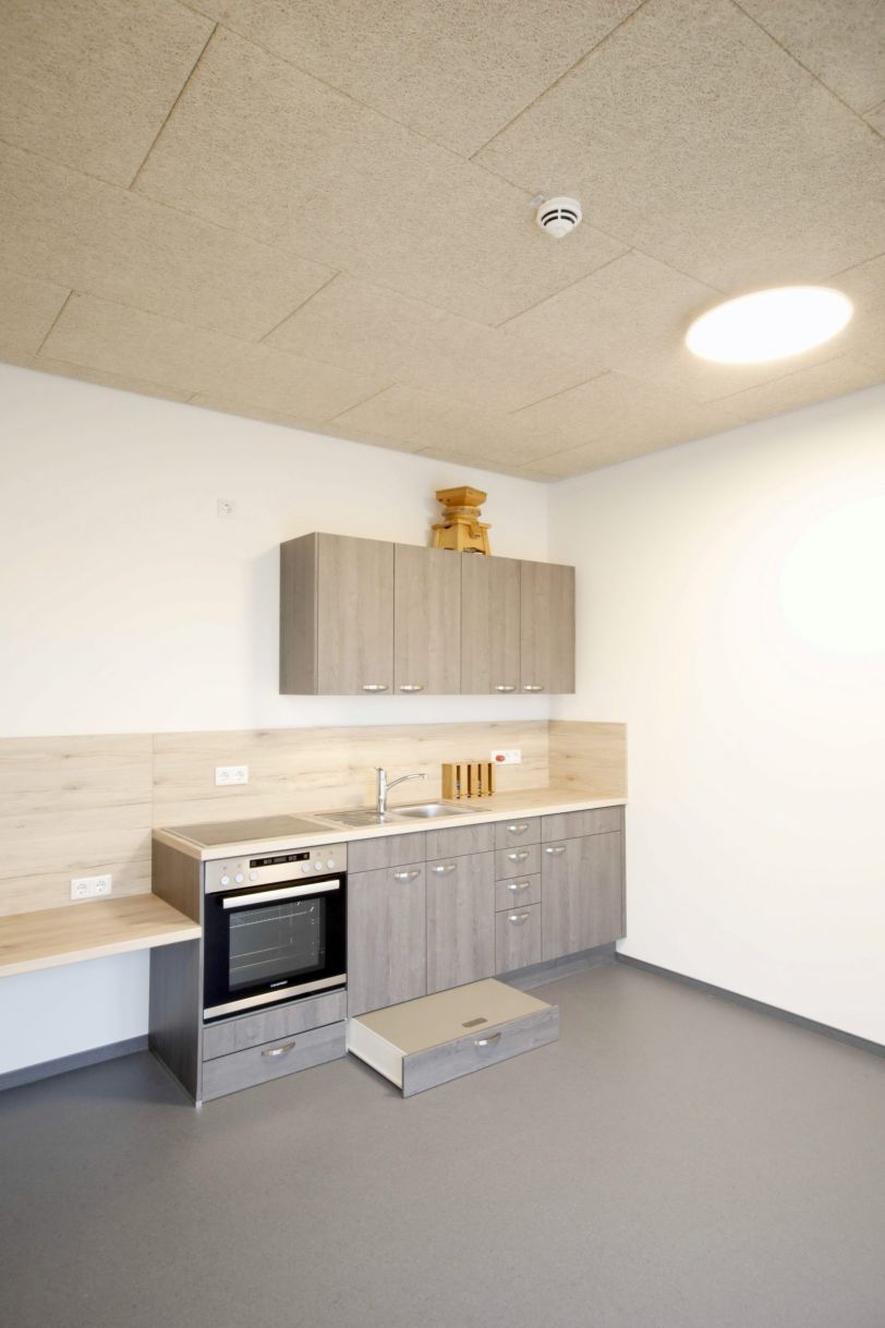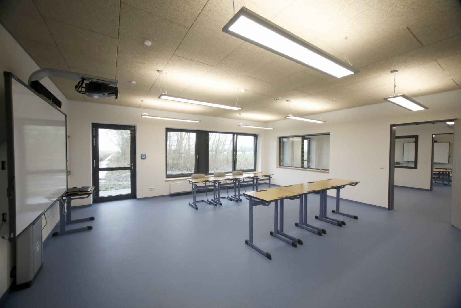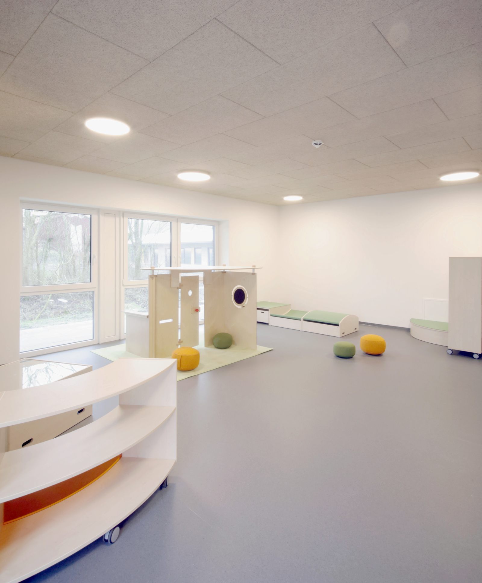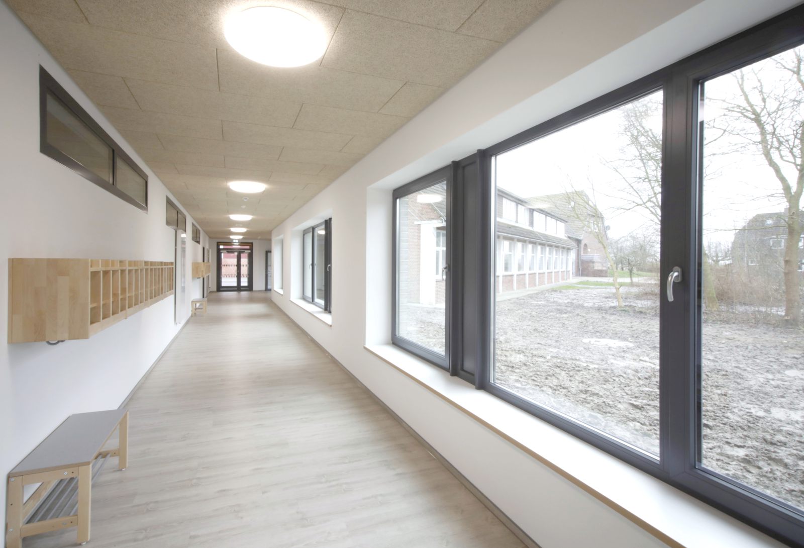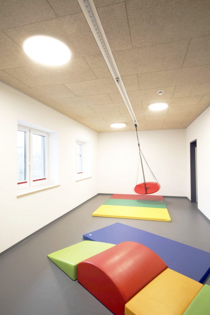 Das neue Gebäude für die Kita, Mensa und Schulerweiterung wird als eingeschossiges Gebäude in direkter Anbindung an die vorhandene Schule vorgesehen. Der Hauptbaukörper mit Mensa und Kita nimmt die Nord-Süd Struktur der landschaftlichen Umgebung auf. Der neue Schultrakt stellt die Verbindung her zwischen Hauptbaukörper und vorhandener Schule. Das Kita-Nebengebäude, in der gleicher Ausrichtung und Dachgestaltung wie das Hauptgebäude, markiert den Eingang zur Kita am Ende des neuen Erschließungsweges.
