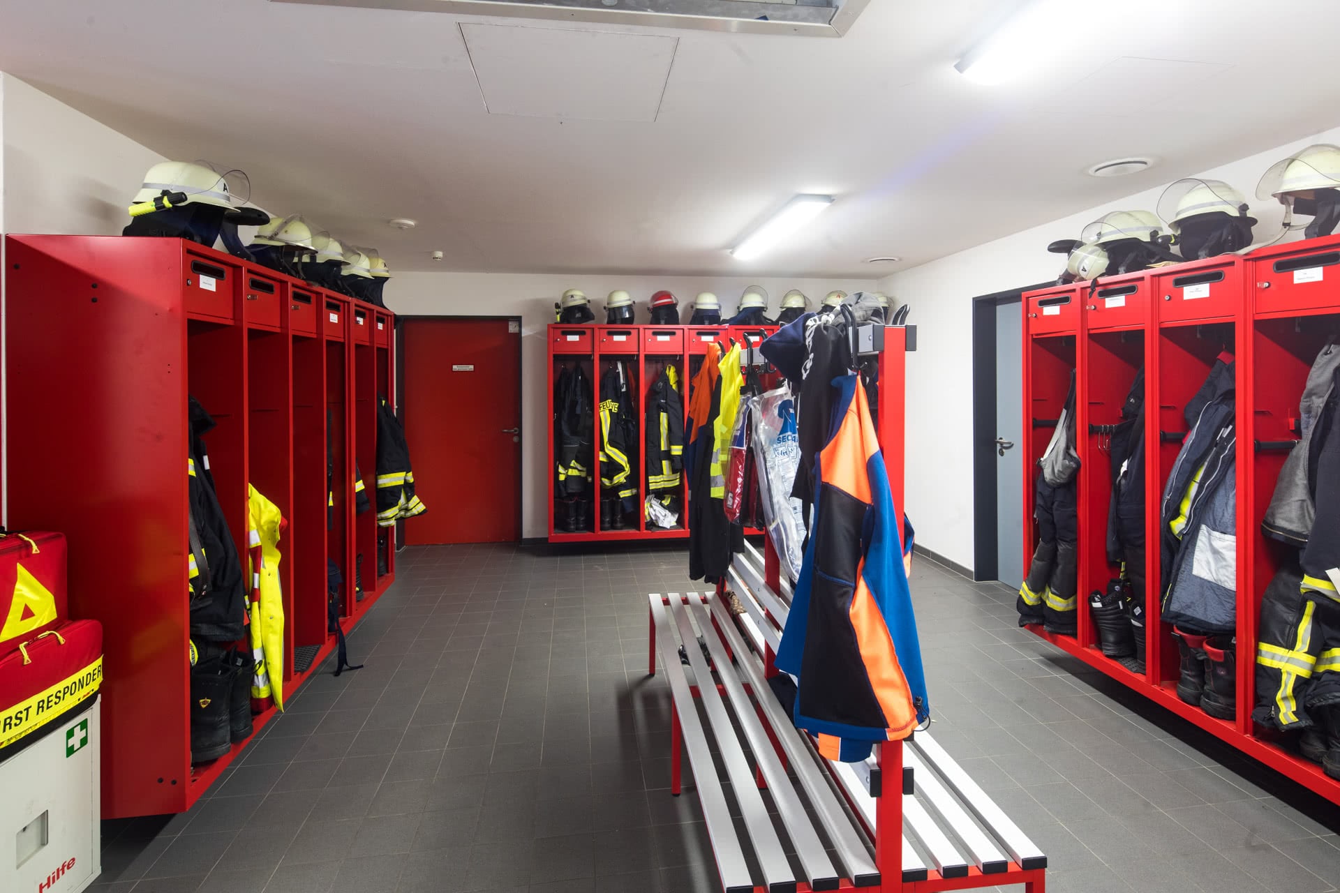 Die Gliederung der Funktionen in eine Fahrzeughalle für vier Einsatzfahrzeuge und einem direkt angebundenen Sozialgebäude mit Umkleiden, Verwaltung, Schulungsraum und Lager-/Werkstattbereich) ist nach Außen durch die Ausformung von zwei Gebäudeteilen deutlich ablesbar. Zur Straße verdeutlicht die Fahrzeughalle mit einer anthrazitfarben Metallbekleidung und vor allem den großzügig verglasten Sektionaltoren ihre Funktion. Im rückwärtigen Bereich stellt dagegen das Sozialgebäude mit sandfarbenen Verblendsteinen eine Verbindung zur Dünenlandschaft der Umgebung her.