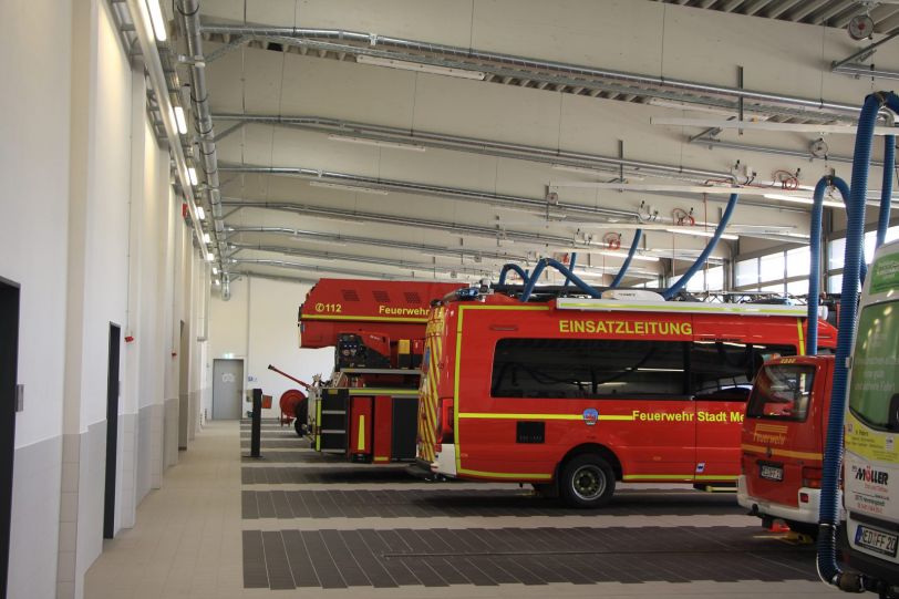 Der eingeschossige Neubau in Meldorf beinhaltet zehn Stellplätze, eine Waschhalle, eine kombinerte Wasch- Werkstatthalle und eine separierte Fahrzeughalle für den Katastrophenschutz. Ergänzt wird das Raumprogramm um dienende Räume für 68 Personen (Sollstärke der Wehr): Umkleidebereich für Damen und Herren mit den entsprechenden Sanitärräumen; Lagerbereiche, Werkstattbereiche insbesondere für den hauptamtlichen Gerätewart , Schulungsbereiche und Verwaltungsräume.