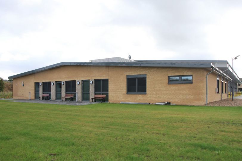 Der Bereich der Fahrzeughalle ist in Metall verkleidet, währeddessen die Aufenthalts und Lagerflächen eine Verkleidung aus hellem Verblendstein erhalten haben.