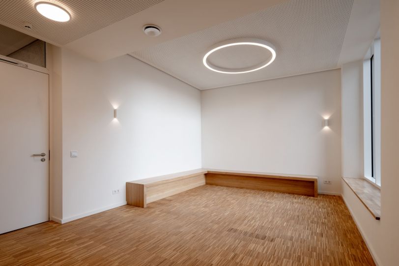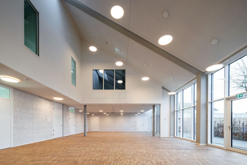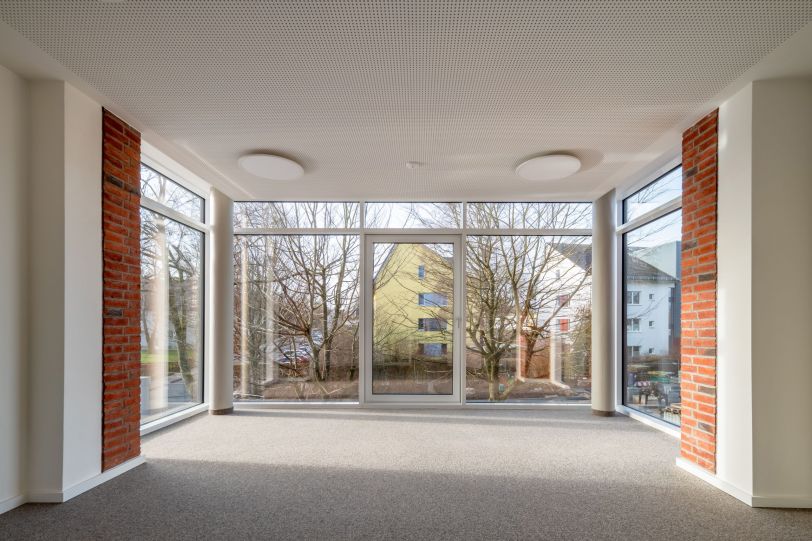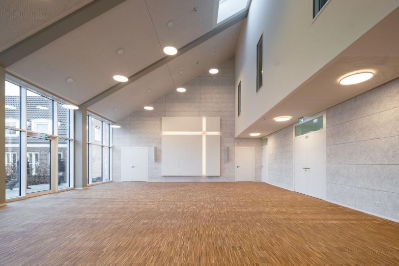 Im Innern bestimmt die Erhaltung der vorhandenen Belichtungselemente des Kirchengebäudes Nutzung und Raumanordnung. Der Gottesdienstraum nutzt dabei die Höhe des Gebäudes bis unter das Dach und erfährt durch Oberlichtverglasungen eine interessante zusätzlich Belichtung.