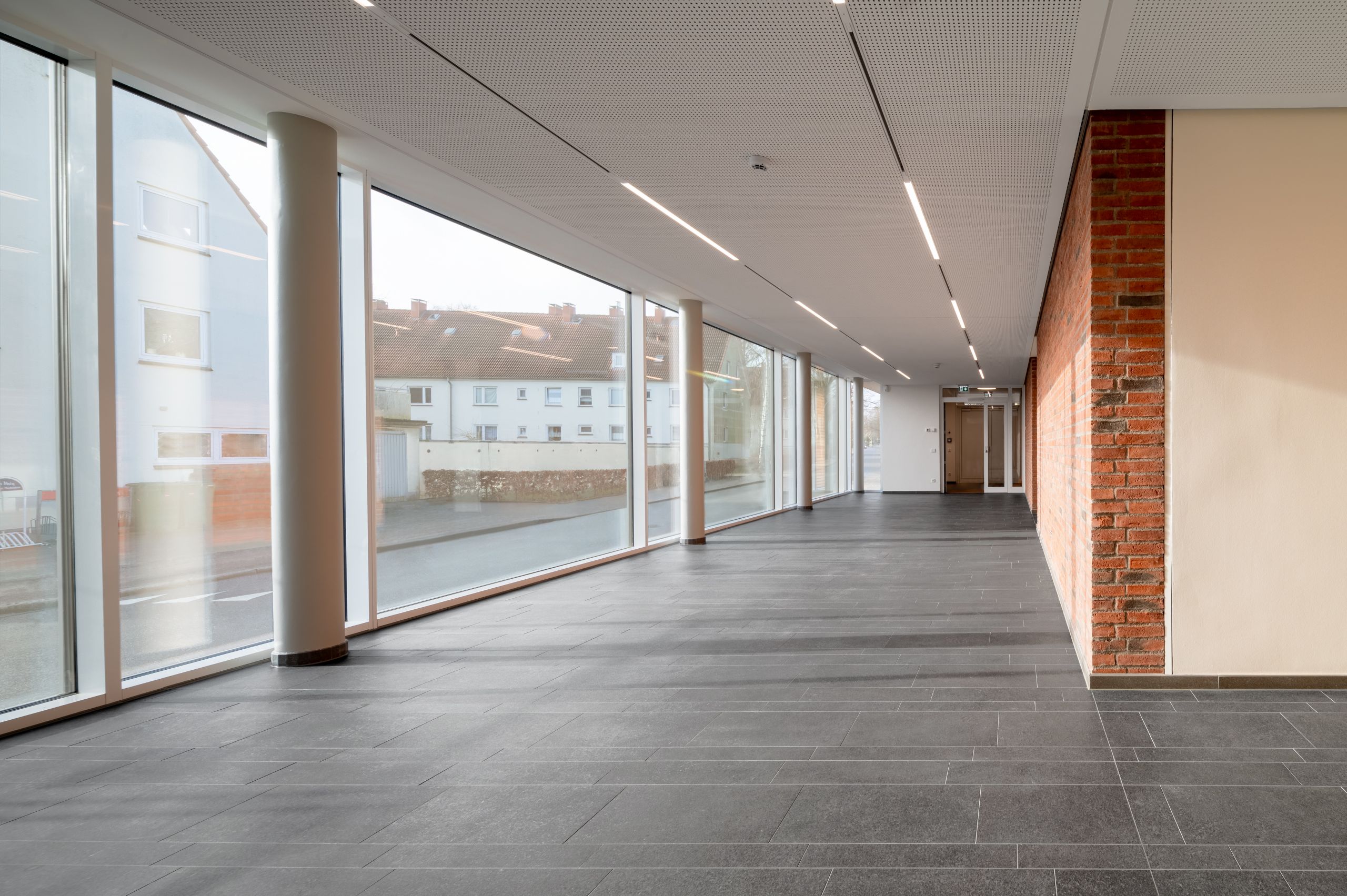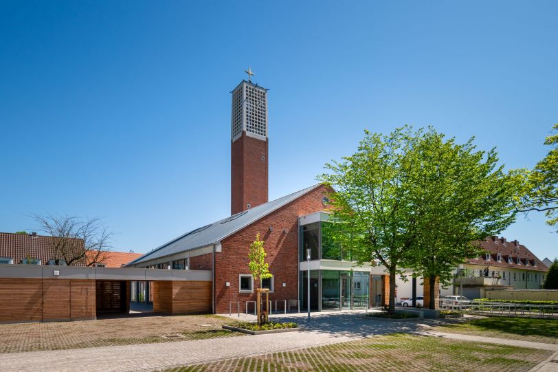Mit dem zur Straße orientierten neuen Foyer öffnet sich Gemeinde nach Außen: Mit großer Transparenz werden Einblicke in das Gemeindeleben ermöglicht.