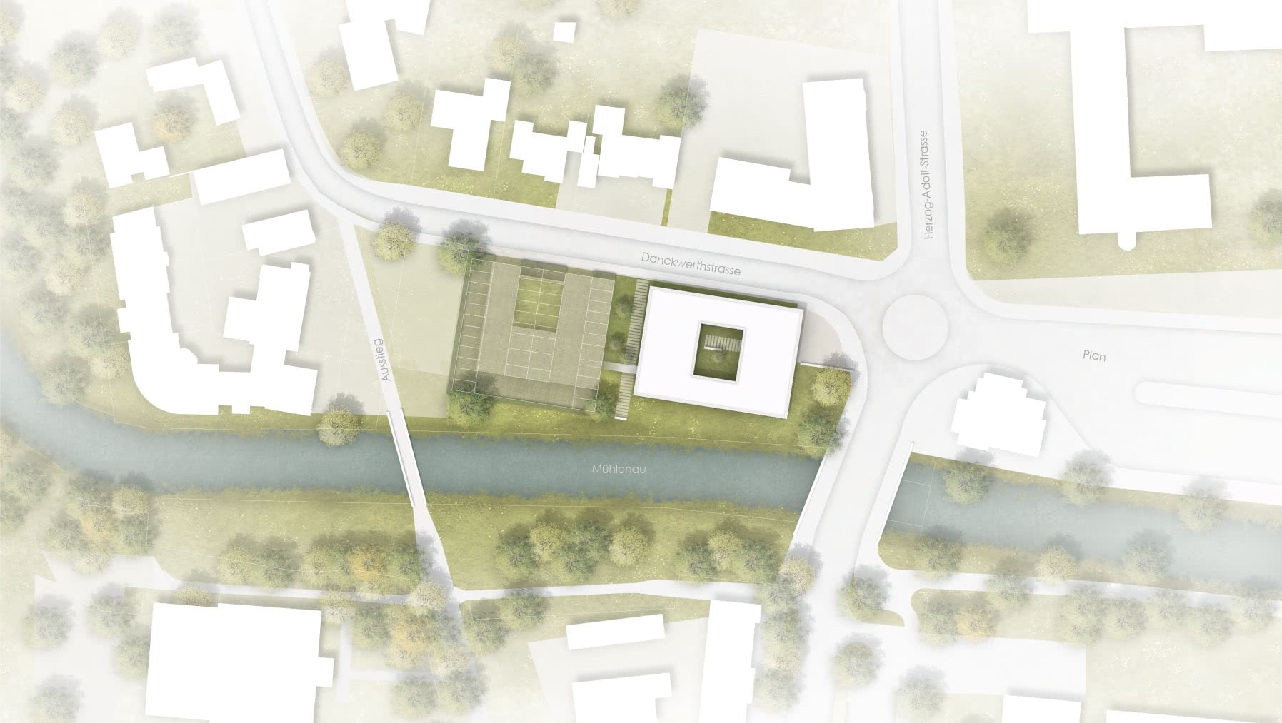 Die Konzeptidee für den Erweiterungsneubau des Finanzamts ist die Ausformung eines einfachen und sehr kompakten Baukörpers, der hohe räumliche Qualitäten bietet. Das als viergeschossiger Stadtbaustein entwickelte Gebäudekonzept nimmt dabei die Flucht der südlich gelegenen fünfgeschossigen Wohnbebauung auf und besetzt das Grundstück an der Ecke Danckwerthstraße/ Herzog-Adolf-Straße ohne die Sicht auf die Treppengiebelfassade des bestehenden Finanzamtsgebäudes zu verstellen.