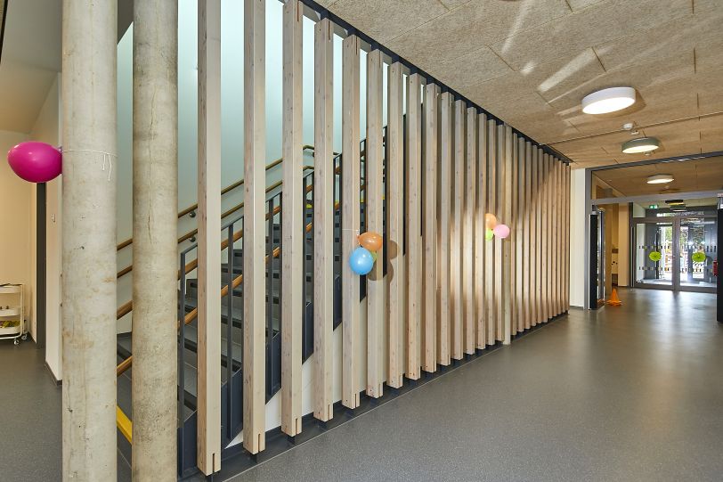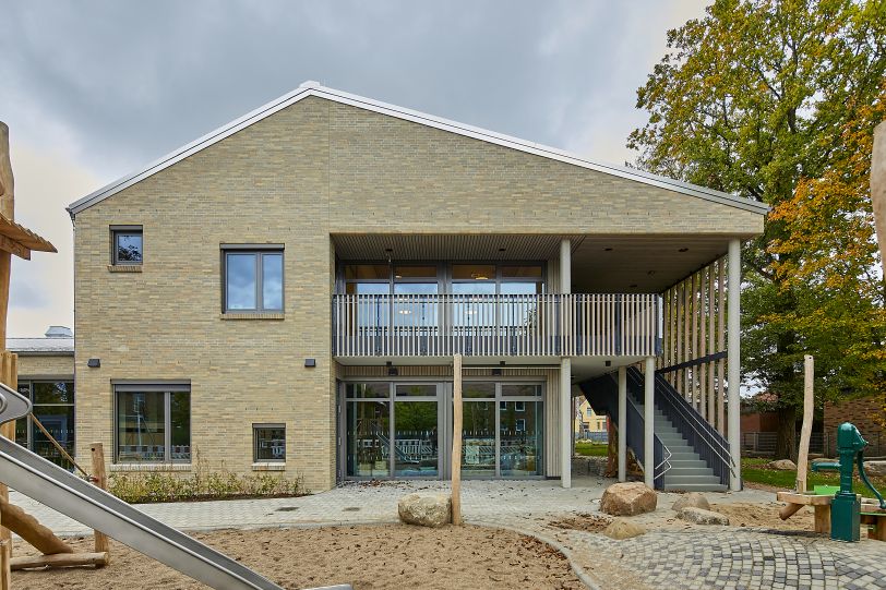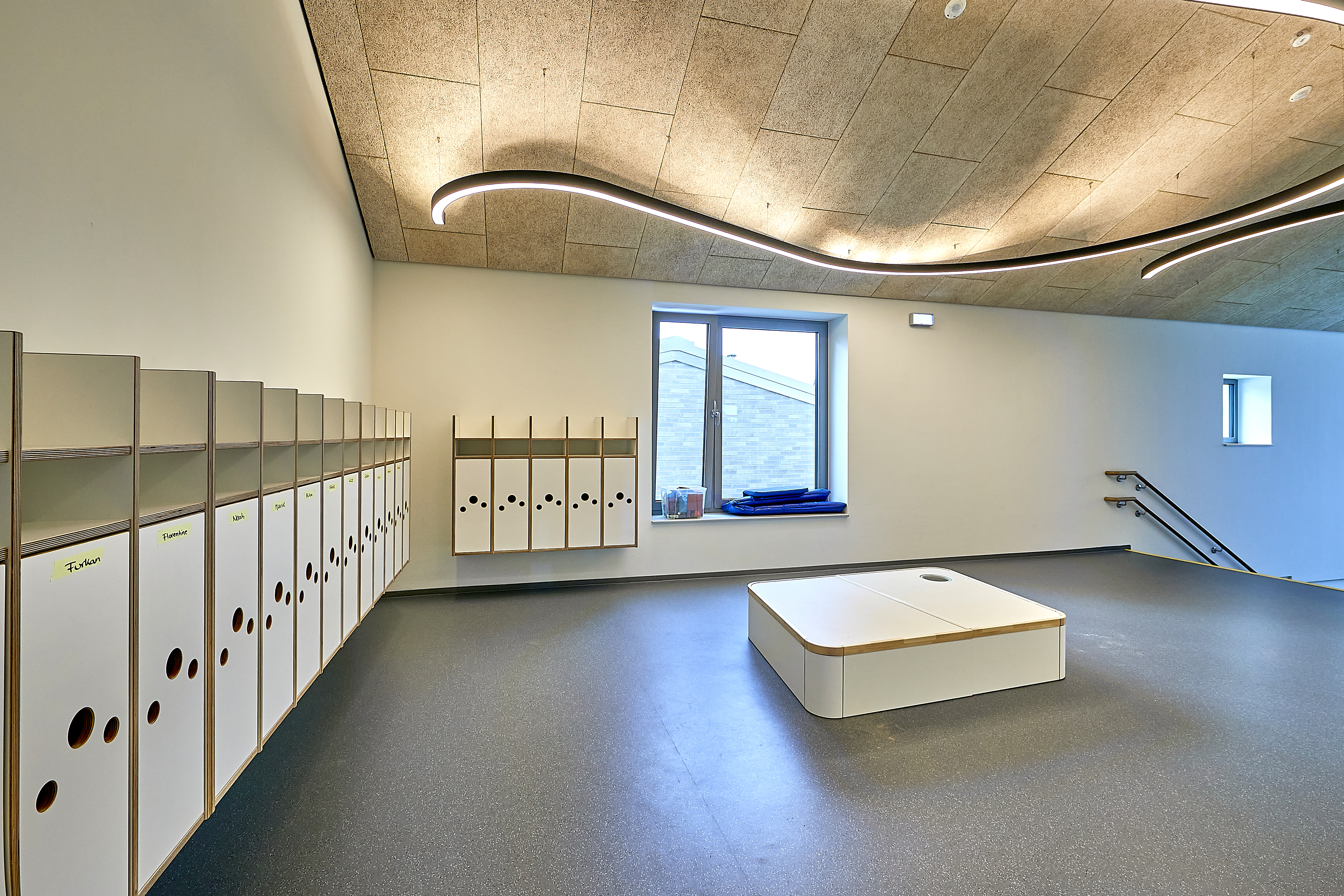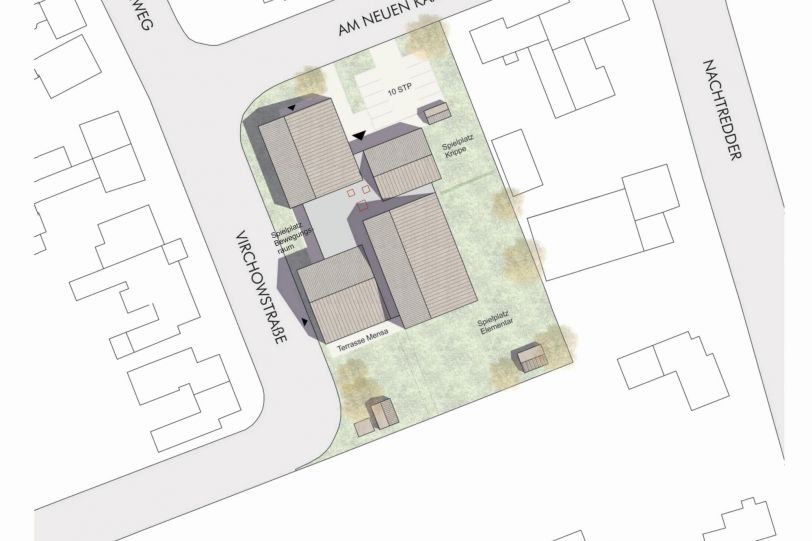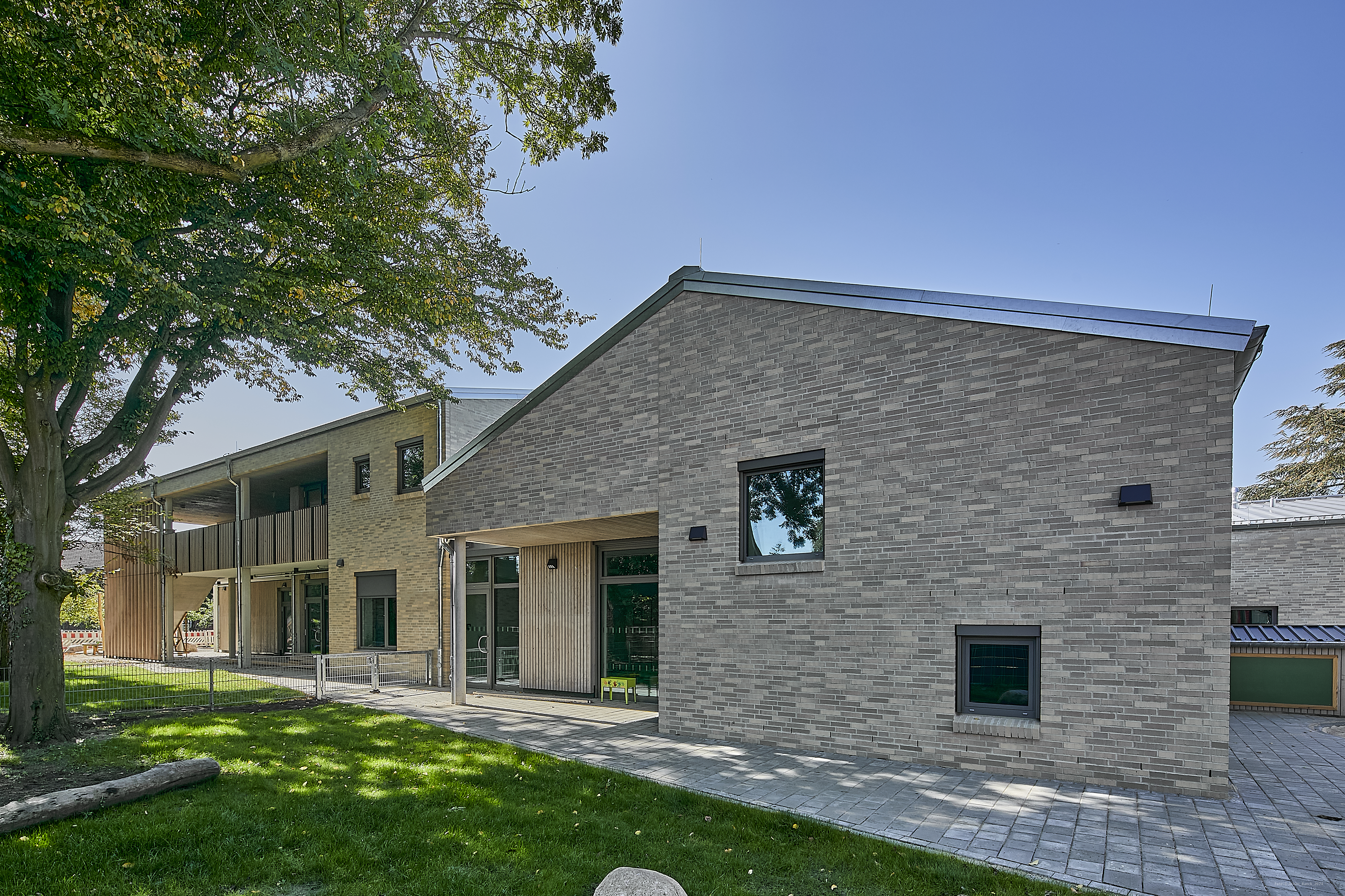Das Programm mit Räumen für insgesamt fünf Gruppenbereiche, eine Mensa und einem Familienzentrum wird baukörperlich in vier Einzelbaukörpern mit Satteldächern und einem verbindenden, eingeschossigen Gebäudeteil mit Flachdach umgesetzt. Damit fügt sich das Gebäude ein in die überwiegend aus Einfamilienhäusern mit Satteldächern bestehende Nachbarschaft.