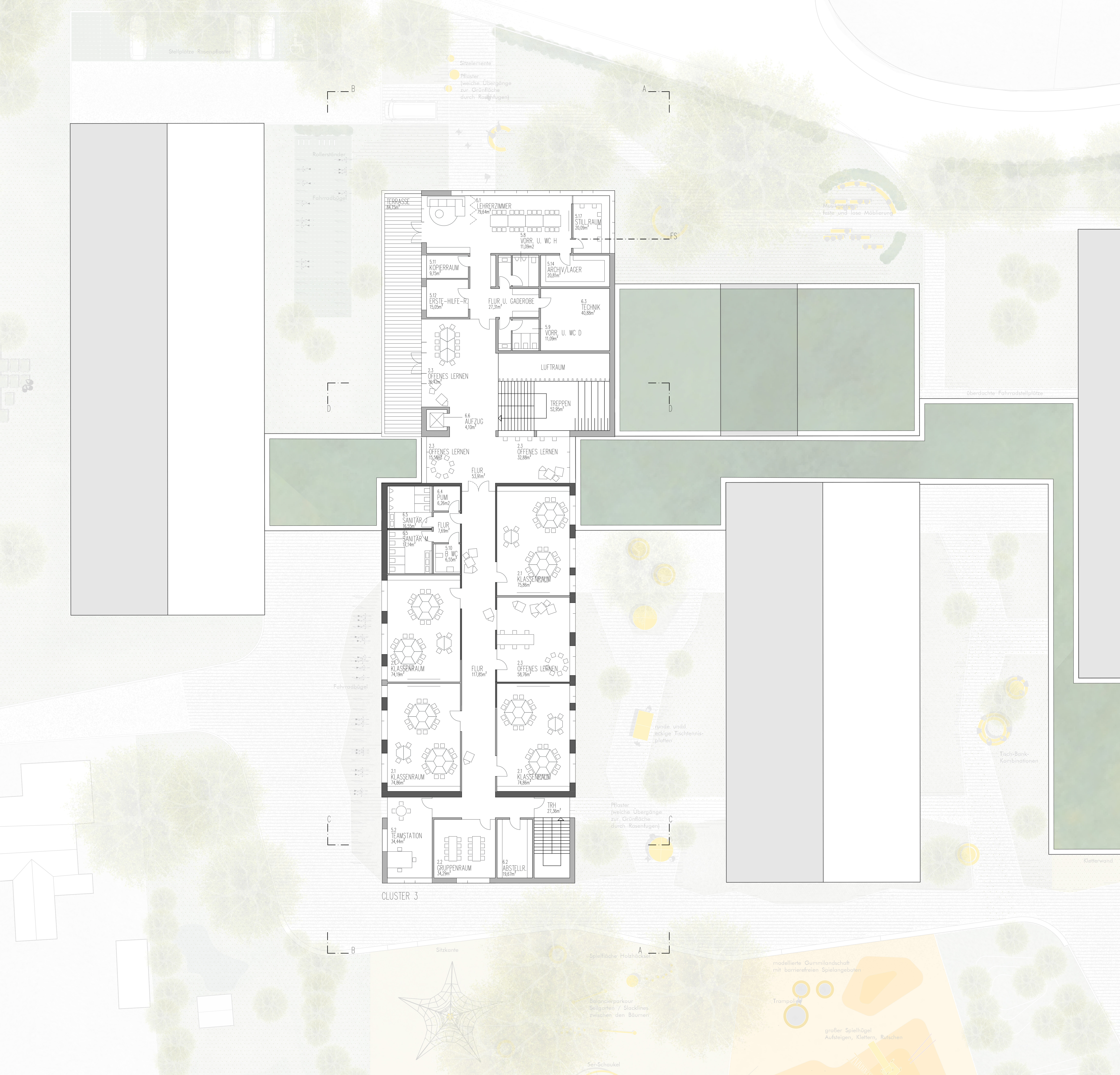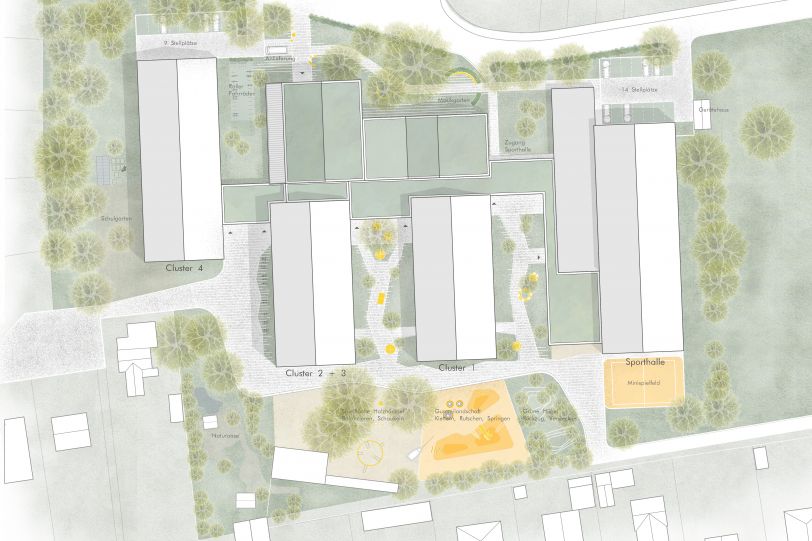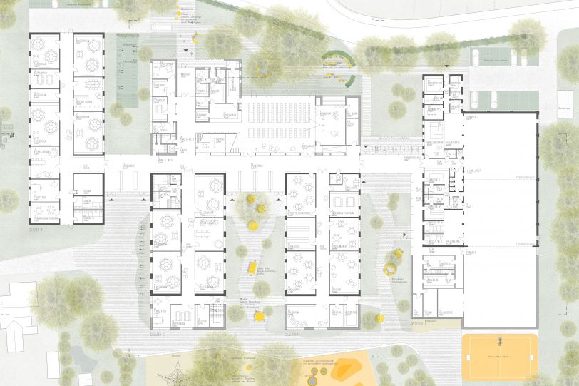 Ein grüner Eingangsbereich mit Sitzgelegenheiten bildet den neuen Treffpunkt der Schule. Die Schule ist um eine multifunktionale Aula/Mensa zentral organisiert, von der aus alle Bereiche kurz erreichbar sind. Großzügige Lernlandschaften, flexible Raumangebote und eine barrierefreie Erschließung fördern inklusives Lernen. Die Außenanlagen mit Spiel-, Rückzugs- und Bewegungsflächen bieten vielfältige Nutzungsmöglichkeiten.